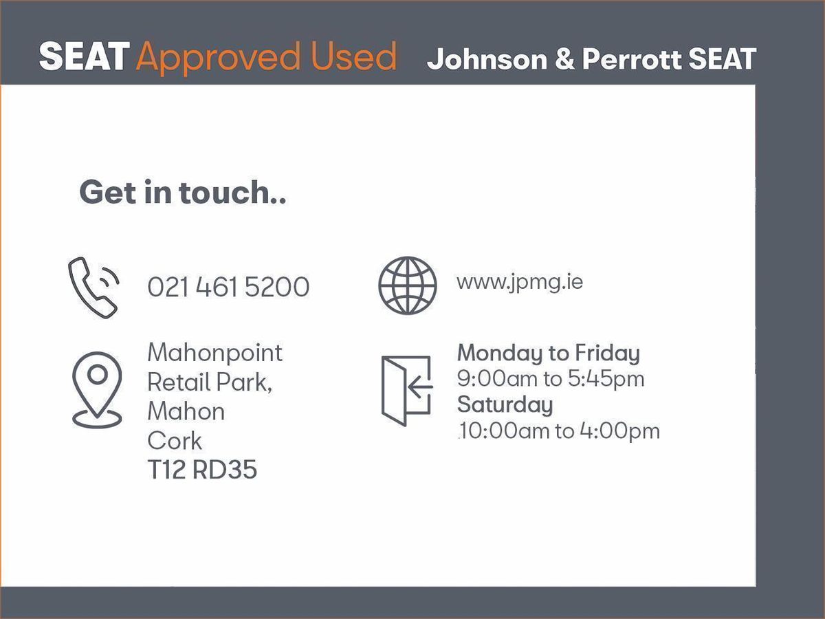 For more information on this vehicle, to book an appointment or a personalised video please call 021 461 5200. Alternatively, you can visit us at Johnson & Perrott Mahonpoint, at our Showroom in Mahonpoint Retail Park, Mahon, Cork T12RD35. We are open Monday - Friday 09.00-17.45 and Saturday 10.00-16.00.